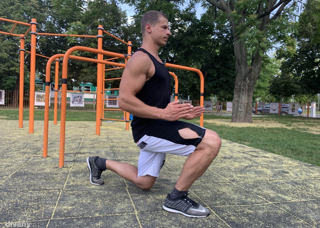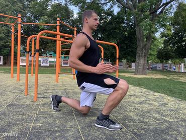 „Talán furcsán hangzik, hogy a térdünket előre kell tolni, de ez egy combdomináns gyakorlat, amivel az elöl lévő lábat terheljük. Az a jó, ha érezzük, hogy megnyúlik a combunk, az pedig csak tévhit, hogy nem mehet előrébb a térd a lábfejnél. Egészséges embereknél legalábbis semmilyen ellenjavallat nincs erre” – magyarázza Erdélyi Ádám „street workout”-sportoló és edző.