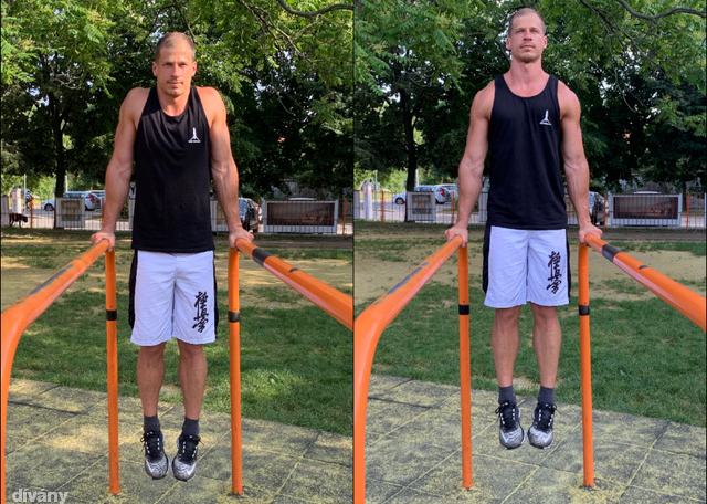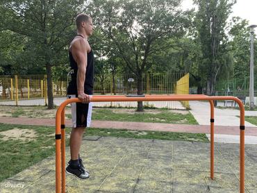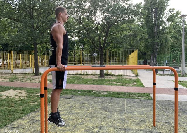 Csavard kifelé a karodat annyira, hogy a könyökhajlat előre mutasson, így kisebb az esélye, hogy kifelé megy tolódzkodásnál, másrészt stabilabb lesz a vállöv. Ebből a helyzetből told el magad minél magasabbra, ezáltal a lapockák süllyednek, aktiválódik a széles hát-, valamint a kis és nagy mellizom is. Figyelj arra, hogy egyenes legyen a tartásod, zárd a lábakat, és ne lógasd a fejed. Ha a korláton már stabil és magabiztos a támaszhelyzeted, akkor a gyűrűn is megpróbálkozhatsz vele.