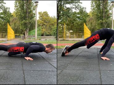 Nehezíthető a fekvőtámasz a dőlésszög variálásával is: ha úgy pozicionálod magad, hogy a vállad a kezed előtt marad, még jobban megdolgoztathatod a vállizmokat. Távolítsd a lapockákat, mintha már a kiinduló helyzetnél is eltolnád magad a talajtól.