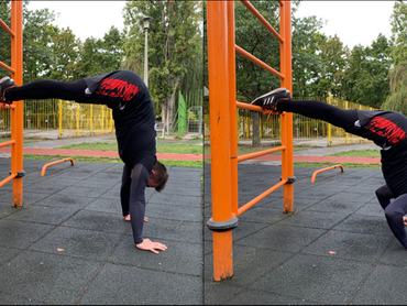- A kiindulóhelyzet tulajdonképpen egy félkész kézállás, amelynél a lábak 90 fokos szöget zárnak be a csípővel. „Fontos, hogy ne a lábakra helyezzük a súlyt, hiszen nem a váll tehermentesítése a cél, hanem a megdolgoztatása” – figyelmeztet az edző.