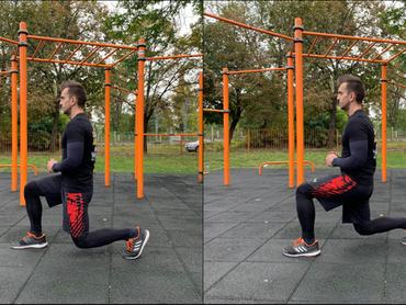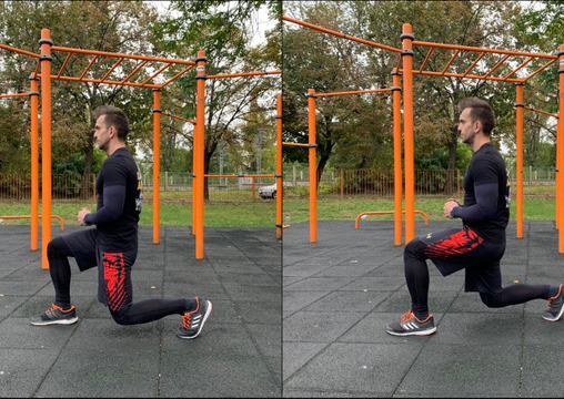 - Amikor a combod közel párhuzamos lesz a talajjal, két lehetőséged van: vagy elrugaszkodsz az elöl lévő lábbal a talajtól, hogy visszatérj a kiinduló helyzetbe, vagy pedig felegyenesedsz vele, és a hátul lévő lábbal lépsz egy nagyot előre, azaz sétáló kitörést végzel.