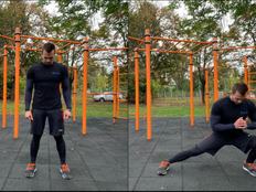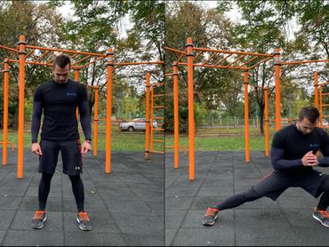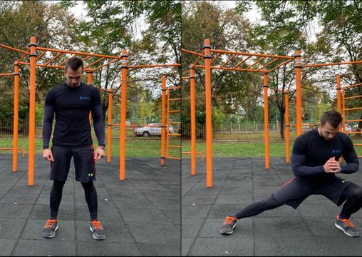 - Belégzés után az egyik lábaddal lépj ki oldalra, told hátra a csípőd, közben hajlítsd a térded, és lassan ereszkedj le – mintha egylábas guggolást végeznél –, a támasztó lábadat pedig teljesen nyújtsd ki. Kilépéskor a karodat húzd a mellkasod elé, és kulcsold össze a kezeid.