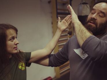 - Visszakézzel érkező pofon esetén a támadó felénk lendített karját szorítjuk a felsőtestéhez, majd szintén erőteljes tolással és rúgással folytatjuk az ellentámadást.
