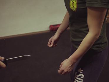 - Ha sikerül kibillenteni, földre vinni, leszorítani a támadót, figyeljünk a késre, nehogy magunknak okozzunk vele sérülést.