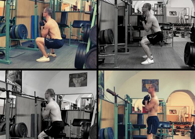 „Guggolás közben egy kettlebellt tartok a kezemben, innen a serlegguggolás elnevezés. Ez a típusú guggolás inkább erő-állóképességet fejleszt, szemben a maximális erőt fejlesztő olimpiai rúddal végzett guggolással. Sőt, mivel a kettlebellt magunk előtt tartjuk, a bicepsz is dolgozik. Egy 24 kg-os kettlebellel kétpercenként 15-20 ismétlést szoktam végezni, a pihenőidőben pedig egy másik gyakorlatot végzek a guggolással felváltva – például fekvőtámaszozom, lábemeléseket végzek vagy ugrókötelezem” – mondta Áron, aki szerint a serlegguggolást érdemes mezítláb gyakorolni, mert ilyenkor arra is tudunk figyelni, hogy a talpunk stabilan érintkezzen a talajjal.