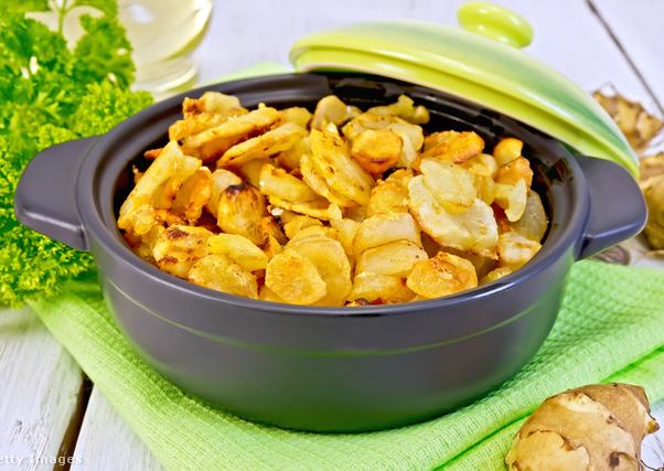 Arra viszont érdemes figyelni, hogy elég agresszívan terjed, ha nem foglalkozunk vele, és lombozata is viszonylag nagy helyet foglal. Ha jól érzi magát, egy tő alól 4-5 kg gumót is összegyűjthetünk. De ha nincs lehetőségünk vagy kedvünk foglalkozni vele, akkor már sok helyen megtalálható a zöldségespultokon. Gyakran a krumplihoz hasonlítják, engem inkább a gyömbérre emlékeztet a megjelenése, de íze a gyömbérével ellentétben inkább semleges, kicsit édeskés. Fogyaszthatjuk akár nyersen salátaként is, de főzve vagy akár csipszként is nagyon finom. Ha gyakran szerepel a menüben, az segít vércukorszintünk és súlyunk kordában tartásában, és még számos jó hatása van az egészségünkre.