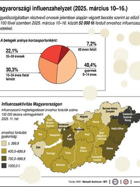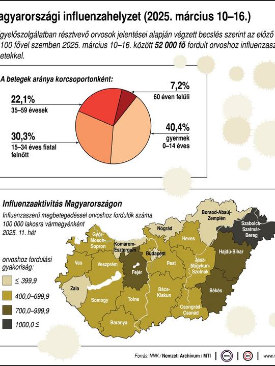 A heti jelentésből kiderül: a március 10. és 16. között influenzaszerű tünetekkel orvoshoz fordult betegek 40,4 százaléka 14 év alatti, 30,3 százaléka a 15-34 évesek, 22,1 százaléka a 35-59 évesek, míg 7,2 százaléka a 60 éven felüliek korcsoportjába tartozott.