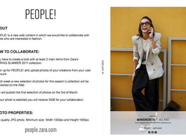 A Zara ugyancsak ezt a vonalat lovagolja meg legújabb, People! elnevezésű streetstyle-kampányában. Olyan fotókat várnak, amelyeken a feltöltő legalább két, a 2011-es tavaszi/nyári kollekcióból származó darabot visel. A feltöltők közül hetente kiválasztanak egy csokrot és közzéteszik a honlapjukon. Akinek kiválasztották a fotóját, annak 300-425 dollár ütheti a markát a közreműködésért. Bár az aktuális kollekcióra vonatkozó kampány épp lecsengőben van, szeptemberben az őszi fotók feltöltésével folytatják.