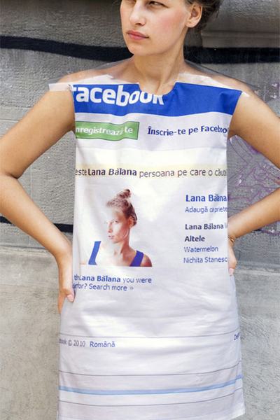 A hónap minden bizonnyal legrosszabb ötletét hozta a román Lana Dumitru ezzel a meglehetősen ostoba elgondolással: a Facebook profil nejlonszerű anyagra nyomtatva nem annyira kinyilatkoztatás, mint inkább divatkatasztrófa. Különösen a szabását nézve érzi úgy az ember, hogy a célja nem is volt más, mint hogy minél több helyen tegeljék a nevét. Rajtunk nem múlik, gratulálunk a 15 perc hírnévhez, Lana!