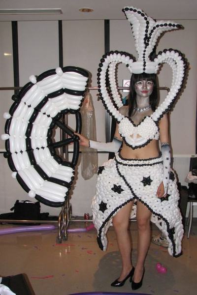 Korábban már megismerkedtünk a legszexisebb kiegészítőkből készült cipőszobrokkal, és ezen az úton tovább – feljebb - haladva szédületes megoldásokba botlunk. A leginkább ember nagyságú karácsonyfadíszre emlékeztető kreációk lufiból készültek, és a Hollywoodi székhelyű Big Top Balloons stúdió egy 2008-as divatshow-ra rukkolt elő velük. Az igen színes viselet természetesen csak a kifutón lélegzetelállító, hagyományos utcai használatban már pukkanna, és igen kényelmetlen viselet lenne, nem beszélve a jellegzetes idegtépő lufi-nyikorgásról. Az, hogy a divatshow végén kinek készült ki teljesen a tüdeje, a ruhák keményre fújása miatt, rejtély – persze, valószínűleg kompresszorral dolgoztak, az ollót és a tűket pedig kizárták az öltözőkből.