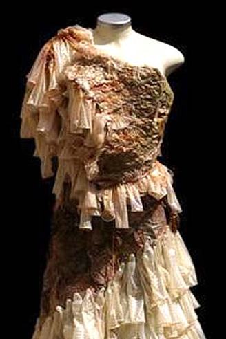 Adriana Bertini a tehetséges brazil művész - aki egyébként Greenpeace aktivista - azért kreált ruhát óvszerekből (vélhetően nem használt darabokból) hogy felhívja a figyelmet az AIDS-esek és a HIV-pozitív gyermekek helyzetére. Filozófiája szerint az óvszer is egyfajta ruha, csak máshol hordjuk, használat után pedig eldobjuk. Ezzel környezetszennyezést hajtunk végre, hiszen a speciális módszerrel előállított óvszerek égésterméke rendkívül káros. Mire lehet akkor használni? Lehet belőle ruhát varrni? Lehet. Ha esküvői ruhának nem is, egy koktélpartira bátran felvehető.