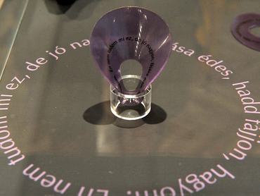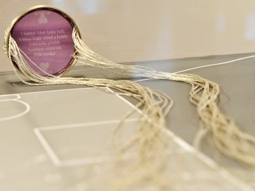 Ahogy korábban fémmel kombinált szaténszálak, feltekert szalagok, csipke, alumínium, szőr és pihe egyaránt megjelent a munkáiban, ezúttal is a legkülönbözőbb anyagok hordozzák a szerelmes szavakat: legyen az csipkés szélű keszkenő, vagy vöröslő viaszszív (a gyertya csonkig égésének esélyével). A kiállított ékszerek a szerelem témakörén belül három fázist járnak körül: a szerelem gyötrelem, a szív meggyógyítása és végül a beteljesülés: a művész az utolsó állomáson még – ha jól láttam, csehszlovák – bélyegeket is a nemes cél szolgálatába állít. Augusztus 21-ig érdemes megkeresnünk a saját történetünket ezen a misztikus ráolvasásokkal, szerelmes szavakkal és szenvedéllyel teleszórt ékszerösvényen.