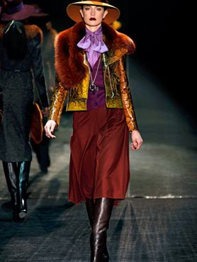 Frida Giannini, a Gucci főtervezője a következő szezonra is megmaradt a 70-es éveknél, annak is azonban a szégyentelen luxus változatánál. Fő inspirációja a legendás nightclub, a Studio 54 és a fiatal Anjelica Huston volt, a ruhák tökéletesen hozták a stílust. A tavaszi kollekcióhoz hasonlóan most is ragyogó drágakő-színeket használt: smaragdzöld, rubinvörös, ametiszt-lila, amiket sokszor szokatlanul párosított egymással a tervező.