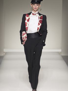 A Moschinonál Rossella Jardini szintén a férfias-nőies pólus hangsúlyozására ment rá. Őt viszont nem a rosszfiús, sokkal inkább az egyenruhás vonal inspirálta: mintha csak egy tengerészeti díszszemlére csöppentünk volna, a hangulatra a tányérsapkák is rásegítettek. Itt szó sem lehetett arról, hogy el legyenek méretezve a ruhák, minden szabásvonal nagyon feszesen állt a helyén. Színekben a fekete-fehér mellett a tengerészkék, a bordóba hajló vörös és az arany volt jellemző.