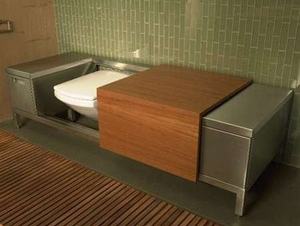 Ez a darab első látásra egy sima doboz, pedig a Julien Bench Toilet elnevezésű darab arra való, hogy a dolgunkat végezzük rajta. Ez az a pillanat, amikor a klozet nem a könnyítés puszta eszközévé, hanem bútorrá válik. Olyan precíz és nemes, hogy az ember nem is meri rendeltetésszerűen használni. A formatervezés Troy Adams amerikai designer munkája: a WC inkább egy zen kertbe kirakott padra emlékeztet, és ezzel a megoldással zseniálisan álcázta is a csészét. A rozsdamentes acélból készült vécépadba be van építve a WC, amit elcsúsztatható falemezzel takartak. A bútorunk nem csak mutatós és modern, de helytakarékos is, hiszen a fából készült panelre pakolhatunk bármit. Ha ilyenünk van és vendégeket hívunk, nem árt nekik előzőleg bemutatni, nehogy a mosdótálat vegyék igénybe, ha nem találják a fajanszot.