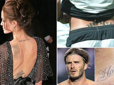 Mindketten nagy gyűjtők, akik a szeretteikre vonatkozó feliratokkal sem spóroltak. Jolie-nak tíznél több ismert tetoválása van, többek közt tigris a derekán, latin felirat a hasán, khmer védő szöveg a lapockáján, illetve minden gyereke születési helyének földrajzi koordinátái a karján. Beckhamen is elég nagy az összevisszaság: egy csomó keresztény szimbólumot varratott magára, de felesége neve például szanszkritül szerepel a karján, ráadásul elrontva. A gyerekei nevét szerencsére nem bízta a véletlenre.
