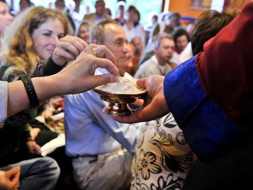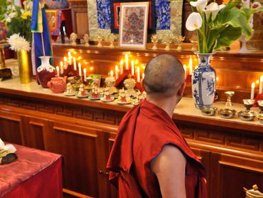 A dombra felvezető úton elhelyezett tábla arra figyelmeztet, hogy megszentelt földre léptünk, lehetőleg viselkedjünk is ehhez méltóan. Amikor tavaly láttuk a templomot, jóformán még csak a falai álltak, most azonban hatalmas változáson ment keresztül, felkerült rá az autentikus festés és bevezették a villanyt is. Az érdeklődők számára a templom építési folyamatait külön blogban dokumentálták, csakúgy, mint az oltárt uraló két és fél méter magas Tara szobor készítésének metódusait. Mivel a szertartásterembe csak cipő nélkül lehetett belépni, a bejáratnál csinos zöld szatyrot kaptunk, ebbe kellett belerakni, majd magunkkal vinni lábbelinket. A kritikus tömeg lassan annyira összetömörült, hogy egy idő után már nem lehetett beljebb jutni, sokan maradtak kint, és a bent zajló eseményekről kihangosítón keresztül értesülhettek. Néha még Laár András feje is fel-felbukkant a tömegben.