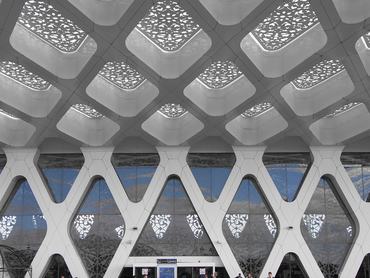 Újabb jó példa arra, hogyan jelenítető meg a nemzeti jelleg egy repülőtéri terminál belső építészetében. Marrakesh új 1-es terminálja olyan, mintha egy 21. századi marokkói palotában járnánk. A klasszikus, csipkézett iszlám motívumok köszönnek vissza, beágyazódva a káró-alakzatokat formáló fehér betonhálóba – ahogy a nap átsüt rajtuk, úgy rajzolják tovább mintájukat a többi felületre. Esténként különleges világítástechnika varázsol még inkább mesebeli hangulatot a várótermekbe. Akik nem vágynak a modernségre, azok eltölthetik az időt a klasszikus váróban is, amely a 19. századi marokkói gazdagságot idézi, perzsaszőnyegekkel, csillárokkal és kovácsoltvas belső kupolával.