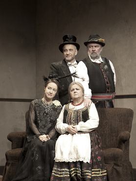 Bagossy László az első és a második felvonás díszleteivel kívánta érzékeltetni a különbséget, ezért míg az első felvonásban egy művésztanya jelenik meg előttünk, úgy ugyanez a lakás a második részre polgári villává változik, ezzel fokozva a család kényelmetlenség-érzetét. Az újonnan kialakult helyzethez egyedül a nagybácsi, Eugéniusz (Csuja Imre) képes önerőből alkalmazkodni, de képmutatása és talpnyalása ugyanúgy nem vezet sehova, mint a mindezidáig totális fejetlenségben élő szülők, Eleonóra és Sztomil (Für Anikó és Mácsai Pál) meghunyászkodása. A vélt vagy valós erkölcsi fölényben lévők sorsa nem túl fényes ebben a darabban, se a nagymama, Eugénia (Pogány Judit), sem a fiú nem jön jól ki a buliból, pedig a nagymama az egyetlen, akinek az élete valójában jottányit sem változott. Az egyedüli nyertes persze a mindvégig (látszat)háttérszerepet betöltő Edek (Debreczeny Csaba) lehet, neki úgyis jó, ha csak egy ténfergő, aki dugja anyát esténként, de az talán egyel jobb, ha ő a ház ura.