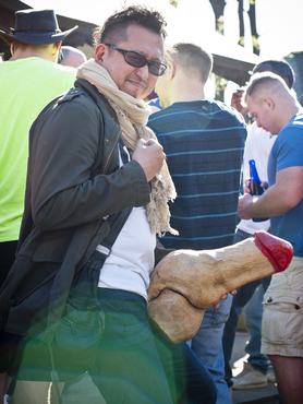 A bizarr fesztiválon egy 280 kilós rózsaszín falloszt cipeltek végig a városon. Nézzen műbránerrel pózoló ünneplőket a galériában!