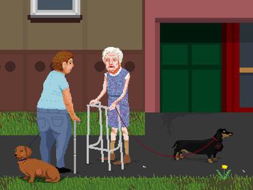 A kispesti otthonomból kell eljutni egy kiállításmegnyitóra a Király utcába úgy, hogy út közben nem koszolod össze magad. Természetesen minden és mindenki akadályozni próbál ebben. Jellegzetes, felismerhető épületek, tipikus budapesti karakterek, dolgok tűnnek fel benne. A párom írja a programot, én pedig a vizuális részén dolgozom, közben együtt ötletelünk. Kevés a szabadidőnk és először csinálunk ilyesmit, ezért sajnos nagyon lassan haladunk. Három pálya készül, jelenleg az első pályán végezzük az utolsó simításokat, ami a Határ út metrómegállóig tart.