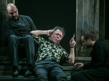 Morcsányi és Valló kihúzták például az összes női szereplőt a Karamazov testvérekből, ami bátor és friss ötlet, ráadásul teljesen indokolt is, megspórol a nézőknek egy csomó felesleges cirkuszt. Ezzel együtt azonban valahogy elveszett a lényeg is az egésszel. Egy szerencse van, hogy az előadás történetét egyszerűbb leírni, mint a regényét. Tehát arról van szó, hogy az alkoholista, gyermekeivel rosszul bánó apát (Gáspár Sándor) meggyilkolja egyik fia a háromból (vagy négyből). Nő is van a háttérben, vallás is, pénz is, no, meg bűn és bűnhődés is, de leginkább három fiú sorsára és lelkük kanosszájára van kihegyezve a történet, ami egymást követő jelenetek sokaságából áll, mindegyik előtt mintegy mankóként kiírva a mondatot (mintha valami operán ülnénk), amelyiket a legfontosabb lesz meghallanunk.
