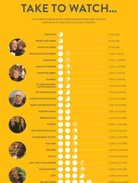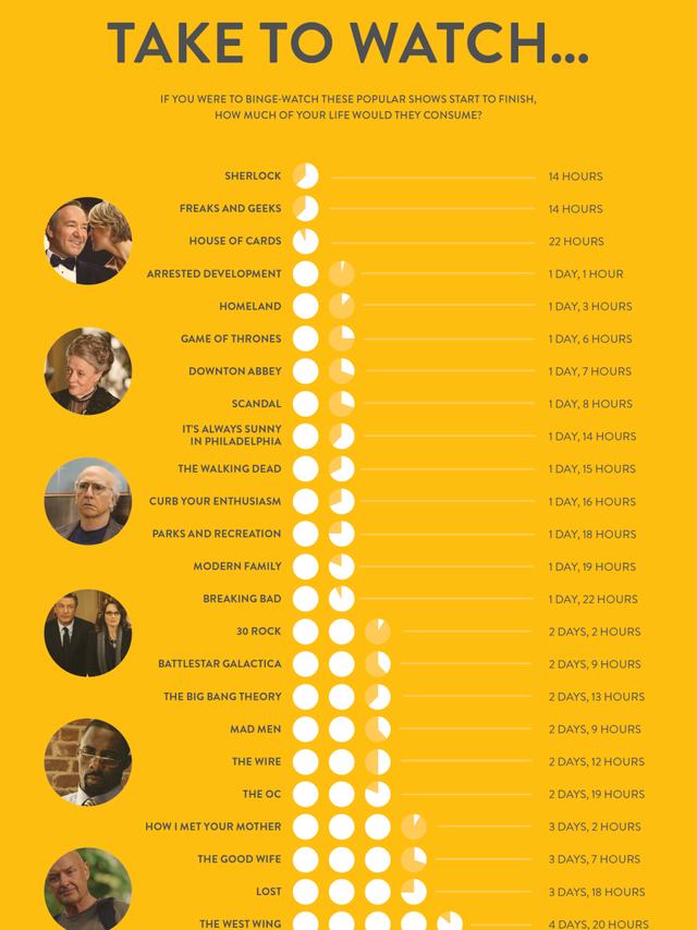 Március 15-én a nemzeti ünnep miatt, ezt követően azonban párt atyuska ötlete nyomán már nem nyithatnak ki az üzletek vasárnap, szóval sokaknak hirtelen nagyon sok ideje felszabadul. Ha nem meccsre vagy misére járna bevásárlás helyett, és mondjuk épp kirándulni se jó az idő, kiváló alkalom lehet ez behozni sorozatnézési lemaradását. A Nielsen infógrafikája nemcsak ötletadásként jópofa, de hasznos is: megmutatja azt is, hogy mennyi időbe telne, ha egyhuzamban végignézné ("szaknyelven" ledarálná) az adott sorozatot. Ha csak a vasárnapot szánná rá, akkor a Sherlock lesz a nyerő – a mindössze 3 évaddal 14 óra alatt végezhet is, de a 24 órába belefér még a Különcök és stréberek (Freaks and Geeks) és a Kártyavár (House of Cards) is.