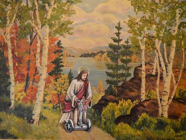 Szeretjük a művészet humoros oldalát, éppen ezért örültünk meg David Irvine fubiz.com-on publikált sorozatának is. A torontói művész használtcikkboltokban vásárol festményeket, amelykekbe úgy lehet új életet, hogy a popkultúra szereplőit festi rájuk. Ebből a sorból kicsit kilóg az erdőben segwayező Jézus, viszont találkozhatunk füvet nyírő Star Wars-szereplővel és a Velencében gitározó Godzillával is. A lenti képre vagy ide kattintva megnézheti Irvine többi festményét is!