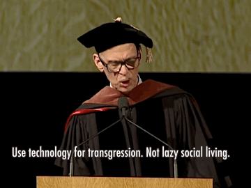 „Elvégezted a főiskolát. Nem lettél öngyilkos, drogfüggő vagy nem kapták idegösszeomlást. De emlékezzünk meg azokról is, akik igen. Mostmár az ideje elkezdeni dolgozni. Rajtad a sor, hogy bajt keverj, de ezúttal a való világban és ezúttal belülről” – fejezte be beszédét az European Graduate School professzoraként is ismert művész, aki szerint kulturálisan érzékenynek és nyitottnak kell lennünk az életben. Nem szabad beállnunk a mások által kijelölt sorba és meg kell néznünk minden olyan filmet, amit lehúz például a New York Times kritikusa és magunktól kell rájönni arra, hogy mit csinált rosszul az a rendező. Rengeteget kell olvasni, olvasni és olvasni, figyelni az embereket az utcán és hallgatózni. És minél inkább öregszünk, annál nyitottabbnak kell lennünk az új dolgokra" - tanácsolja a rendező, és aki nem tudja, miért lett híres-hírhedt például az 1972-es Rózsaszín flamingók című filmje, ide kattintva megnézheti. Igen, az valódi kutyaszar, és Divine, a százötven kilós transzvesztita, de többet nem árulunk el.