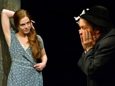 Nemcsak díszlet nincs, de kellékek sincsenek a miskolci Játékszínben – ez Szabó Máté sajátos, bár nem túl eredeti rendezői ötlete a Boldogtalanok előadásához. Az üres térről és a láthatatlan tárgyakról sokat és mélyen lehet filozofálni, mindenféle tartalmakat és üzeneteket lehet nekik tulajdonítani. Nem csekély mennyiségű nézői tapasztalatom szerint azonban hamar meg lehet szokni ezeket a színházi fogásokat. Először még furcsa, hogy Ullmann Mónika láthatatlan ruhát terít nem létező kötélre, majd Nádasy Erika a semmire ül le – egyébként remekül, ebben az ülésben már benne van a sunyin ravaszkodó, egész lényével állandóan színlelő öregasszony jellemrajza. Aztán már fel sem tűnik, hogy nincs az üveg, amiből isznak, a segéd a semmit hozza vacsorára, és így tovább.