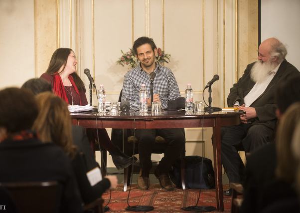 Na, jó, ez egy kicsit hatásvadász volt, essünk is át gyorsan a megfejtésen: „Olyan országban szeretnék élni, ahol a törvény nem csak a kólát védi.” Ez bizony a '80-as évek végén, a '90-es évek elején a fiatal demokraták egyik jelmondata volt, többször is ott díszelgett az akkor még szakállasan a mikrofon elé lépő Orbán Viktor háta mögött. A frappáns sor pedig Röhrig Gézáé, akinek már akkor sem lett volna egyszerű névjegyet csináltatnia. Szerepelt volna rajta, hogy Huckleberry zenekar, frontember, meg hogy színész, rendező, forgatókönyvíró, és elsősorban: költő. Merthogy a Saul fiával sztárrá váló Röhrig ezt tartja a legfontosabbnak, csütörtök este is ezt emelte ki elsőként, miután majd' félórás késéssel megérkezett a zsúfolásig megtelt palota dísztermébe.