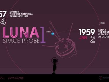 Az oldal néha kicsit lassan töltődik be, de érdemes rászánni az időt (és a hangot is bekapcsolni hozzá), mert látványos és érthető grafikai megjelenítésben kalauzolja végig az érdeklődőt az űrkutatás történetén, fontos évszámain, szereplőin és eseményein. Helyet kapott köztük többek között az űrkorszak kezdeteként és az első mesterséges holdként emlegetett Szputnyik-1 (1957. október 4.), az első mesterséges bolygóvá vált űreszköz, az 1959. január 2.-án fellőtt Luna-1, de megemlékeznek a (szomorú sorsú) Lajka hírnevének árnyékában méltatlanul elhalványult Belka és Strelka kutyáról is, ők voltak ugyanis az első olyan állatok, akik élve értek vissza a világűrből.