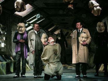 Az első felvonással még nincs nagy baj, megismerjük a szereplőket, és azonnal kiderül az is, ki az, aki nem találja a magát a szerepben. Szatory belesimul a történetbe, de a furcsa maszkokat hol le, hol felvevő szereplők nagy része inkább a saját kellékével van elfoglalva, és nem sokat segít rajtuk az sem, hogy egyszer csak színre lép egy élő hang, Schneider Zoltán személyében. Nagyjából ő az egyetlen, aki száz százalékosan működik az előadásban, de lehet csak azért, mert neki legalább teljesen tiszták, logikusak és érthetőek a szándékai, ellentétben a többiekkel. A felvonás közepén lép be a címszereplő a képbe és Petrik Andrea láthatóan élvezi a játékot, de ettől még kémiáról a két főszereplő között sajnos nem lehet beszélni. A színésznő a férfi itt, és ezzel Szatorynak az ég világon semmi problémája sincsen, nyilván mert nem látja, ahogy a hálószobájában cirkuszol. Nincsen semmi szimpatikus benne, mondjuk ez nem feltétlenül baj.