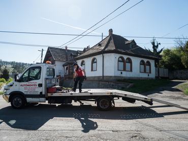 Laci már munkásruhában, egyik kezében telefon, a másikkal felmarkol egy szalámis szendvicset és elköszön. Visszazökkenünk a jelenbe, nekünk is indulnunk kell. Bepattanunk a kisteherautóba és a másik telephely, Szada felé vesszük az irányt. Útközben az autómentésről faggatjuk sofőrünket.