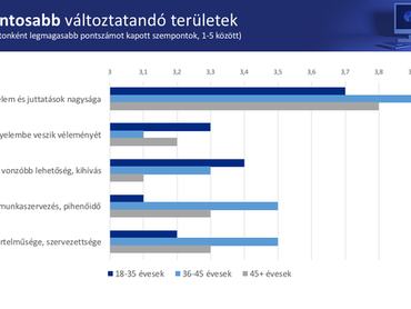 Sok fiatal kevésbé tartja fontosnak az elérhető jövedelmet, ha úgy érzi, hogy befektetnek a tudásába, és hogy az adott ugrással közelebb kerülhet a céljaihoz. Van viszont egy pont számukra, amikor már nem éri meg csak a tudás miatt maradni, komplexebb szempontokat kezdenek el mérlegelni. A felsorolt szempontok fontossága egyébként nagyon hasonlóan alakul a többi korosztályban is, úgy tűnik tehát, hogy amennyiben elégedett munkavállalókat szeretnénk, korosztálytól függetlenül érdemes a fenti kritériumokra tekintettel lenni, és ezeket folyamatosan mérni.