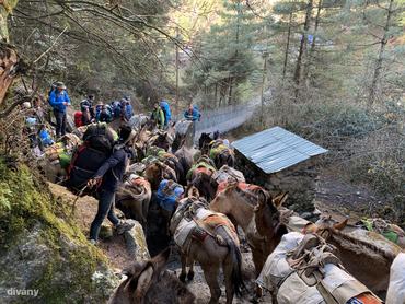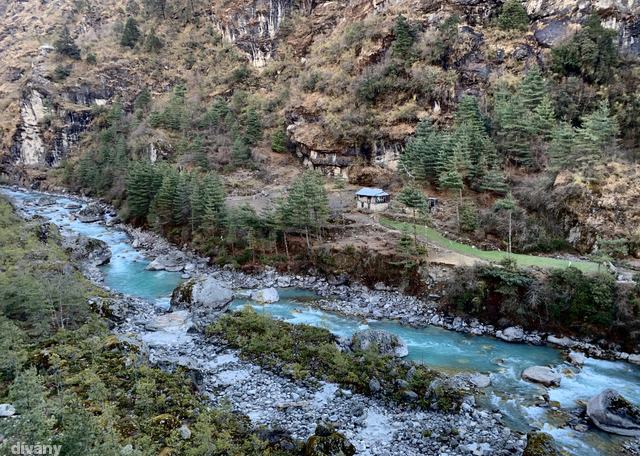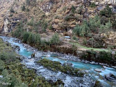 Reggeli után magunk mögött hagyjuk a találgatásokat, és belevetjük magunkat a túrába. Ma, bemelegítés gyanánt csak két és fél órát gyalogolunk viszonylag könnyű terepen, kb. 200 métert ereszkedve a 2600 méter magasan fekvő, és jóformán vendégházakból álló Phakding településig. Utunkat hol apró falvak, hol teherhordó jakok és öszvérek, hol pedig a jeges kékben pompázó Dudh Kosi folyó kanyarulatai keresztezik.