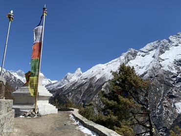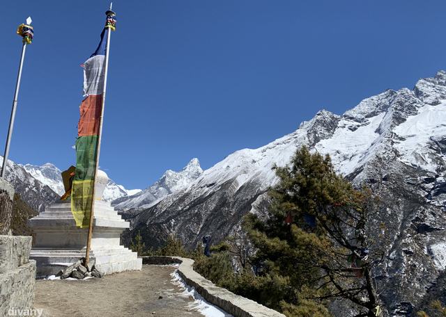 Namche Bazaart elhagyva sokáig kanyargós, jórészt sík útvonalon gyalogolunk, csillagos ötös kilátás és napfelkelte kíséretében. A tegnapi rögtönzött földrajzlecke után már magamtól is felismerem a legjellegzetesebb hegyeket. Előttünk pöffeszkedik a Himalája legszebb csúcsa, az Ama Dablam a maga 6800 méterével. Minél közelebb kerülünk hozzá, annál hatalmasabbnak és annál elérhetetlenebbnek tűnik – a csalóka perspektíva miatt szinte elveszik mellette a távolban lapító Everest.