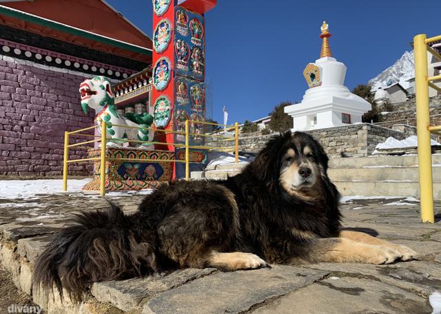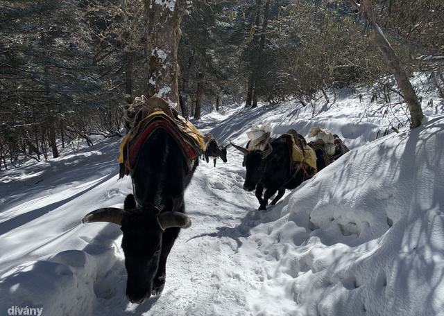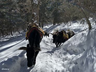 Több mint egy órán át manőverezünk egy jakkaraván mellett Tengboche felé, hol az állatok lassítanak le, hol mi maradunk le, végül egészen a faluig kísérjük egymást. Úgy tűnik, errefelé jobban havazott, mint odafent, ami most kimondottan előny. Itt-ott totyogó üzemmódba kell ugyan kapcsolni a nagy esések megelőzése érdekében, de még mindig élvezetesebb hóban, felfelé menetben csúszkálni, mint latyakban lefelé.