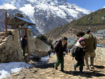 12 óra 50 perc. Éppen kicsöngetnek a helyi iskolában, amikor Namche Bazaarba érünk. A gyerekeket várja otthon az ebéd, és az év végi vizsgákra való tekintettel most nem is kell visszamenniük a suliba délutáni oktatásra.