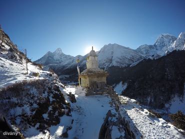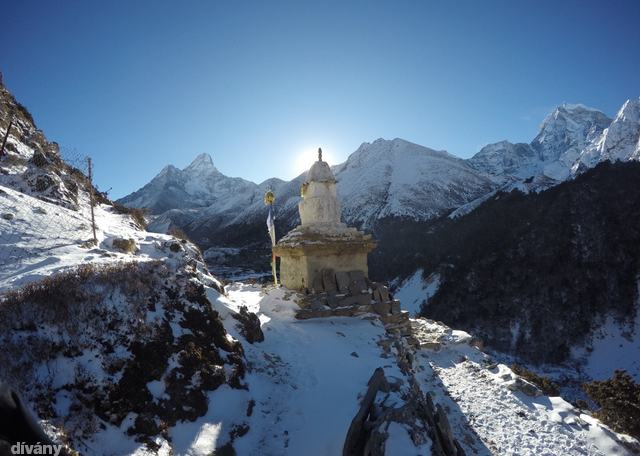 Mintha lényegesen több turistával találkoznánk útközben, mint néhány napja, amikor még mi is felfelé tartottunk. „Most még mosolyogtok...” – jegyzem meg magamban, miközben már tanult Everest-túrázóként köszönök a velünk szembe jövőknek. Namaste! Olyan természetesen buggyan ki ez a szó a számból, mintha a helló soha nem is létezett volna. Most már én is újra mosolygok, nem csak magamba fordulva battyogok. Úgy érzem, újra tudom élvezni azt, ami körülvesz, amit csinálok, akikkel vagyok, és azt, hogy egyáltalán vagyok. Ez a hosszan tekergő útszakasz a kedvencem, sokat el is időzöm rajta a távolba merengéssel, mert innen még utoljára rendesen ráláthatok az Everestre.
