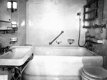 A fürdőszoba berendezését a következőképpen kell elképzelnünk: volt benne egy lábakon álló, zománcozott fehér vagy egy egyszerű vaskád és egy henger alakú, tömör vaskályha, amit szénnel lehetett fűteni. Ez melegítette fel a kályhacsövet és a tartályt, és így lett meleg víz. Volt ezenkívül a fürdőszobában egy hokedli és egy lavór is. A falon tükör, előtte polc, azon fogmosópohár és fogkefe, és mindig ott volt a kor egyik legismertebb szájvize, az Odol. Egy szappantartóban volt a pipereszappan, amit drogériákban árultak – ez fontos volt, mert abban az időben, főleg falun kizárólag állati csontokból főzött szappannal tisztálkodtak, de igazi úrinő házi főzött szappant nem használt. A legismertebb korabeli márka az úgynevezett szarvasszappan volt, amit az 1925-ben alapított Hutter cég gyártott.