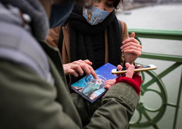 A kiadó megkérdezte, milyen motívumot tudnék elképzelni a borítón. Mondtam, hogy örülnék, ha egy nő lenne valamilyen formában a vízben. A tervező, Féder Márta mutatott is képeket. Akkor tetszett meg nekem Samantha French festménye. Korábban én sem ismertem őt, így a többi munkájára is kíváncsi voltam, hiszen művészettörténészként is fontos volt nekem, mi kerül a borítóra. A festményen látható nőben az fogott meg, hogy zavarba ejtően hangsúlyos a nyaka, van benne valami keménység ezekkel a sötétebb színekkel. A nyak általában a nőiességhez, lágysághoz kapcsolódik a képzőművészetben, itt viszont hagyományos értelemben véve férfias hatást kelt. Az orrán kijövő két buborék szintén izgalmas, nem klasszikus megoldás, ráadásul nem igazán lehet tudni, hogy a nő most merül le, vagy pont ellenkezőleg, most rugaszkodott el a mélyről, és már felfele tart.