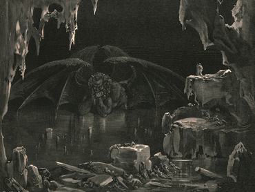 Míg máshol (például Madáchnál) a gonosz gyakran furfangos, számító figuraként jelenik meg, az Isteni színjátékban szinte állatias teremtményként ábrázolja őt a szerző. Dante művében a háromfejű, hatszárnyú bestiaként ábrázolt sátán a pokol legmélyén, a Föld középpontjában egy jégbe fagyott tóban fekszik, de testének csak az alsó fele van lejegelve, törzsét, szárnyait és a fejét szabadon mozgathatja. Állandó kapálózással, hatalmas denevérszárnyainak csapdosásával próbálja magát kiszabadítani, mindhiába: a szárnyverdesés miatt keletkező szél tartja megfagyva a tó vízét, vagyis a zúgolódó szörnyeteg saját magát zárja jégcsapdába.