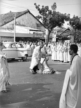 1963. május 8-án egy csoport buddhista szerzetes tiltakozó akcióként a betiltott zászlót lengette az egykori császári főváros, Hue utcáin – a Diem által kivezényelt katonaság sortűzzel oszlatta fel a tüntetést, melyben kilencen életüket vesztették. A szerzetesek nem adták fel, a következő hetekben újabb tiltakozásokat, illetve megemlékezéseket tartottak, június 10-én pedig az amerikai újságírók megneszelték, hogy másnap reggel valami igazán drasztikus dolog fog történni Saigonban, a kambodzsai nagykövetség előtti forgalmas kereszteződésnél.