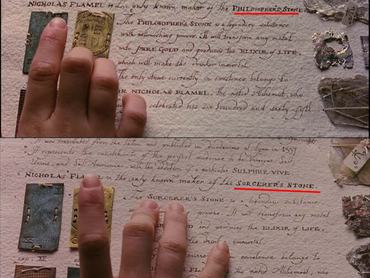 Mivel a regény két különböző címen is ismert angol nyelvterületen – Nagy-Britanniában Philosopher’s Stone, míg Észak-Amerikában Sorcerer’s Stone címmel jelent meg –, a filmet is két eltérő címváltozatban forgalmazták, emiatt egyes jeleneteket többször is fel kellett venni. Amikor például Hermione a címbeli bölcsek kövéről olvas egy könyvben, az amerikai verzióban „sorcerer’s stone”, míg az európaiban „philosopher’s stone” látható a lapon.