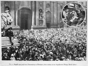 A kérdéses fénykép 1914. augusztus 2-án készült a müncheni Odeonsplatzon, ahol jelentős tömeg gyűlt össze, hogy az egy nappal korábban kelt, oroszoknak küldött német hadüzenet tényét ünnepeljék. A helyszínen tartózkodott Heinrich Hoffmann fotós, aki 6 képet lőtt az eseményről, melyek közül csak egyet publikált a sajtó; egy másikat jóval később, 1930-ban leközölt a náci párt hetilapja, az Illustrierter Beobachter (Képes Figyelő), azonban a két kép közül egyik sem az volt, melyen – állítólag – a későbbi Führer is szerepel.