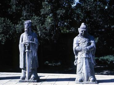 A szobrok éppen annak a tábornoknak, Jüe Fejnek a sírja előtt térdelnek, akit egykor ők juttattak a túlvilágra. A híres történet szerint Qin Hui hamisan vádolta meg árulással az ország egyik legnagyobb katonai hősét, miután az nem volt hajlandó leállítani sikeres hadjáratát az északi hódítók ellen. A tábornokot kivégezték, Qin Hui pedig azóta a hazaárulás jelképévé vált Kínában.