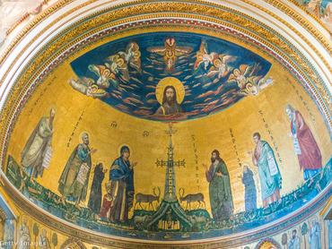A neoklasszicista homlokzat mellett, amelyen a fent említett felirat is látható, a barokk templombelső is sok érdekességet tartogat a látogató számára. A főhajó hatalmas oszlopai között kialakított fülkékben 12 óriási szobor található, amelyek a 12 apostolt ábrázolják. Az alkotásokat 7 különböző barokk művész készítette. A csodálatos kazettás mennyezet Giacomo della Porta munkája, amelyet állítólag Michelangelo tervei alapján készített. A templom szimbolikával legátitatottabb része kétségtelenül az apszis. Az itt található mozaikon egymást érik a jelképek: a felül látható Jézus-portré alatt – a legenda szerint a Megváltó arca csodálatos módon egyszer csak magától feltűnt a szentélyben – egy díszes kereszt, mellette apostolok, valamint egy-egy kisebb alak, akik később csatlakoztak a tanítványokhoz: Assisi Szent Ferenc és Páduai Szent Antal.