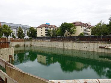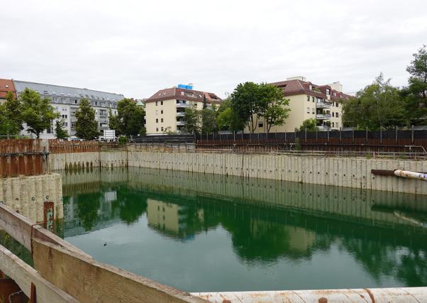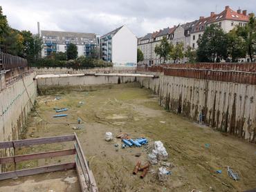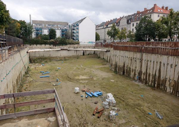 A helyszínen már szemmel látható a változás: a gödör szomszédságában húzódó Alram és az Aberle utcák mentén felállítottak egy 58 méter magas darut, amelyet hamarosan további három, egyenként 45 méteres daru követ. Az építkezésen várhatóan egyszerre akár százan is dolgoznak majd, hogy