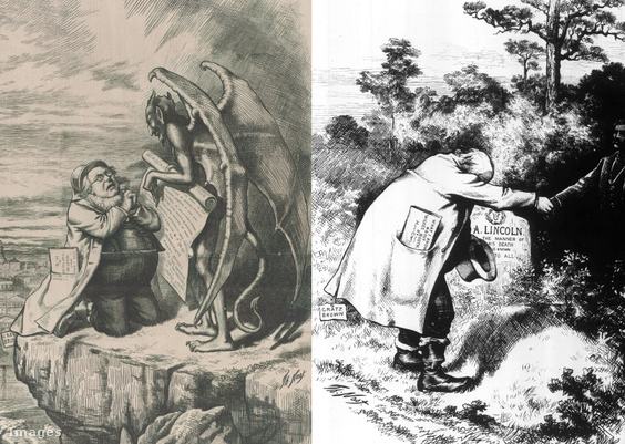 – mondta Gray Williams New York-i várostörténész. És valóban: Thomas Nast, egy politikai karikaturista, aki Grantet támogatta, 1872 januárjától több mint 80, nem épp hízelgő rajzot készített Greeley-ről. Ezek leggyakrabban a demokratákkal való szövetsége miatt ítélték el a két párt közös jelöltjét.